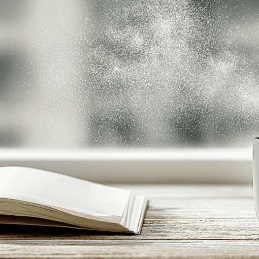 A quiet wooden desk with an open book and pen, reading glasses, a coffee cup, and a small clock, softly lit by daylight, suggesting focused work paused mid-thought.